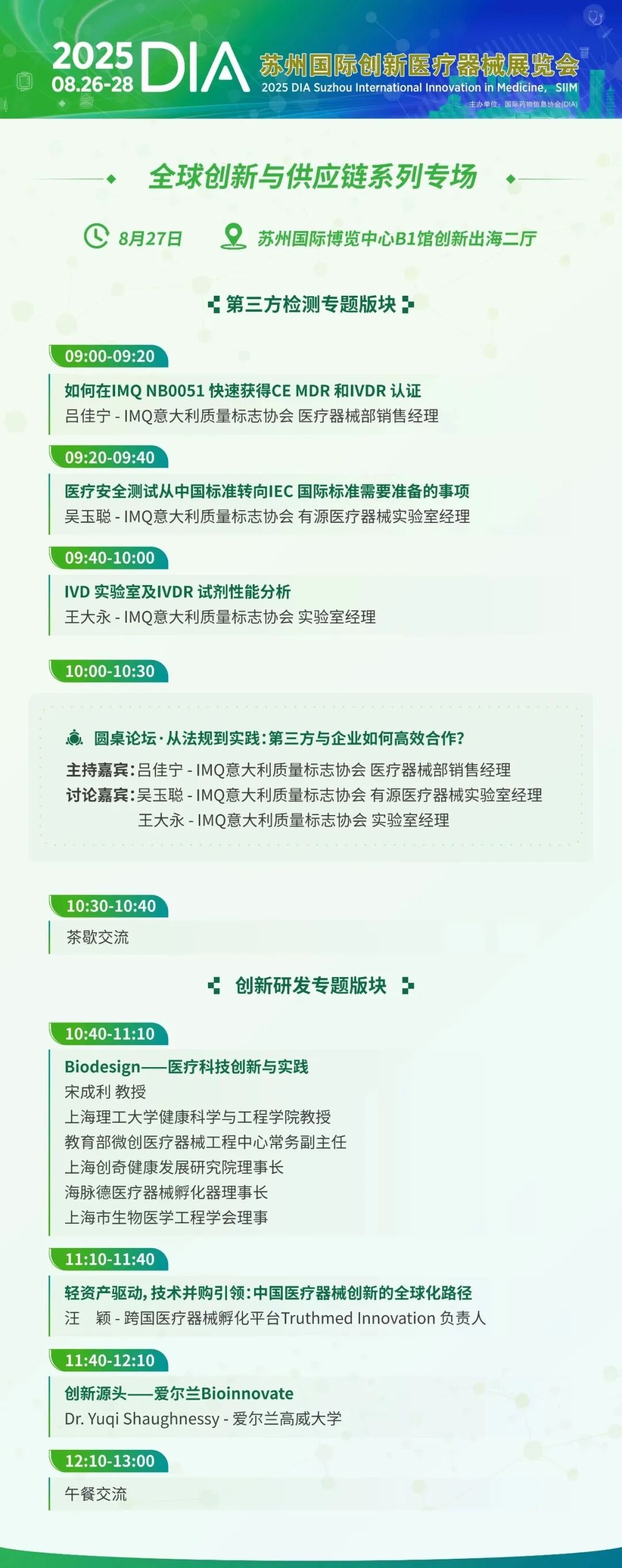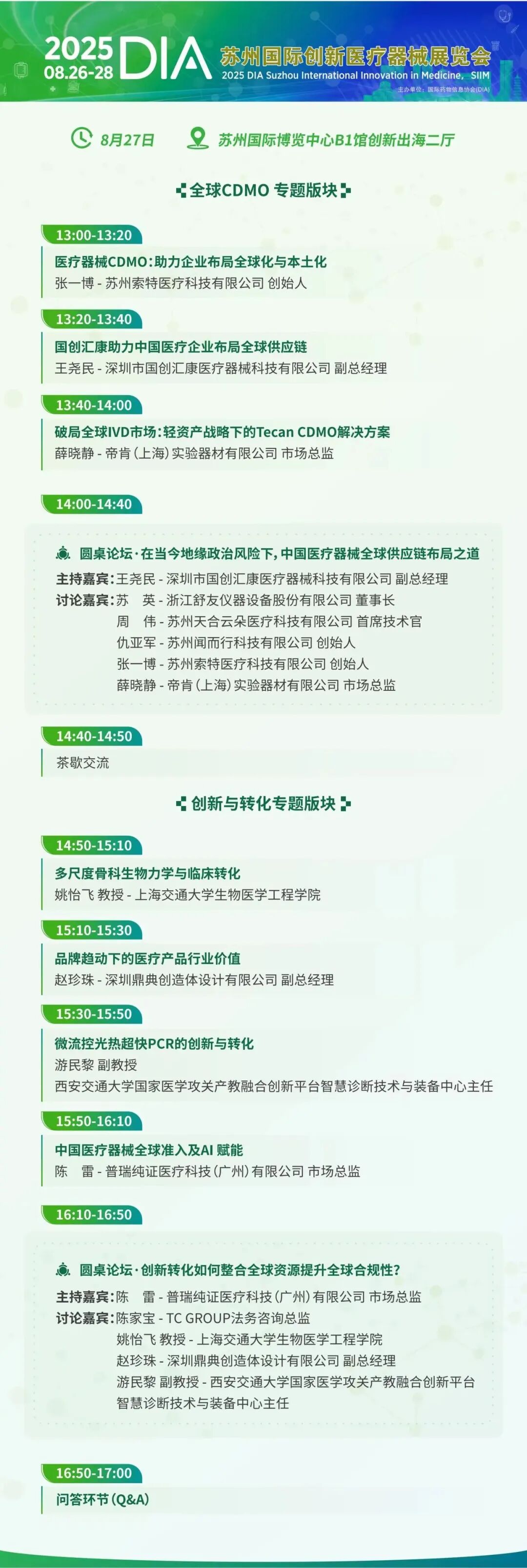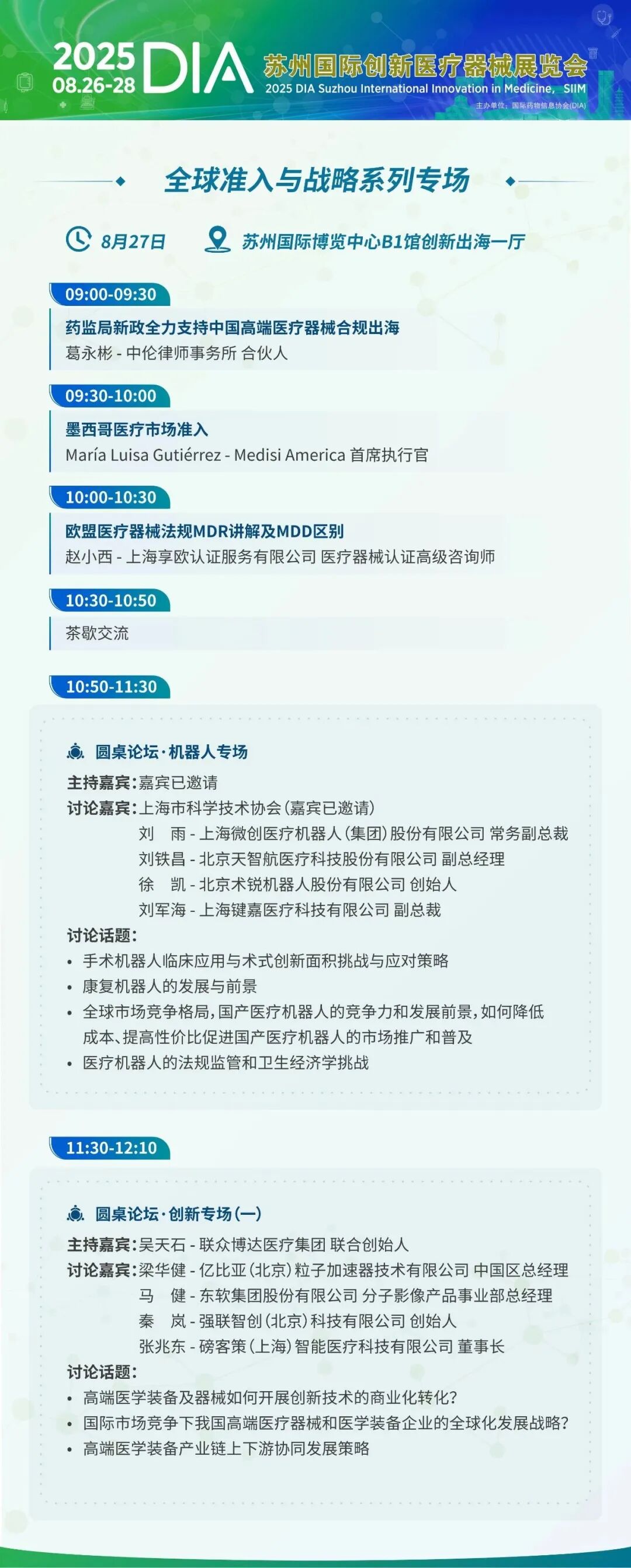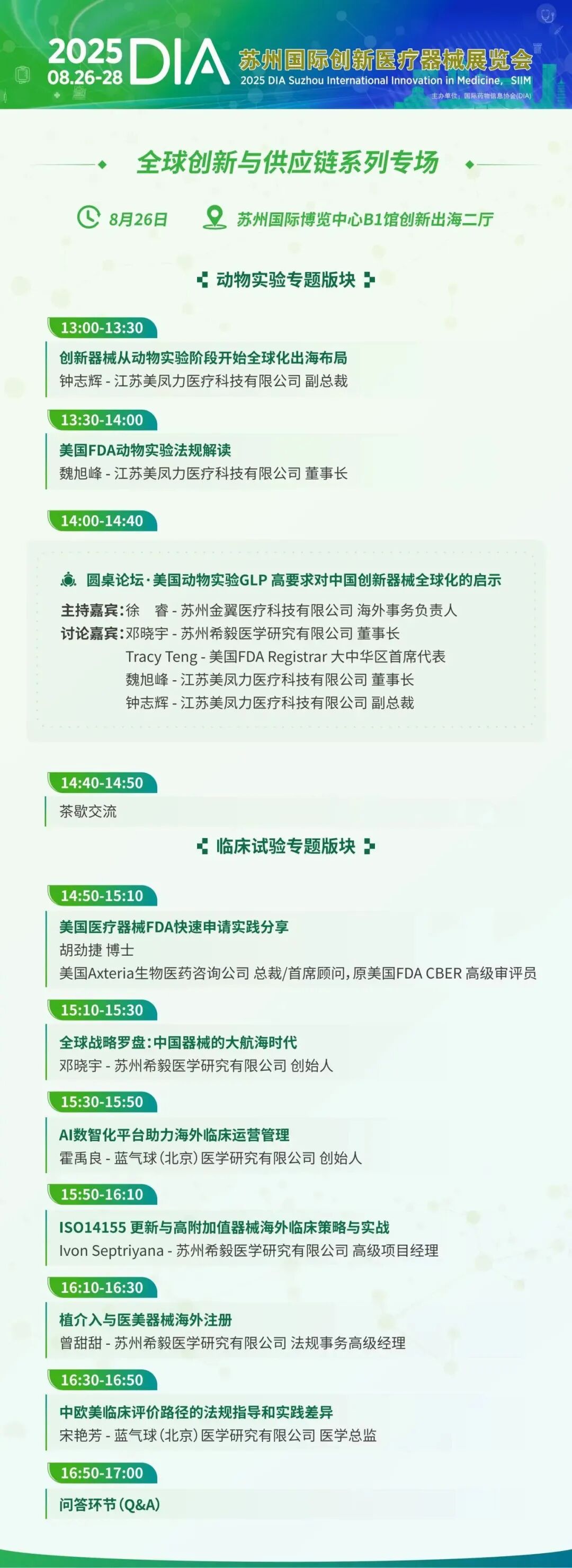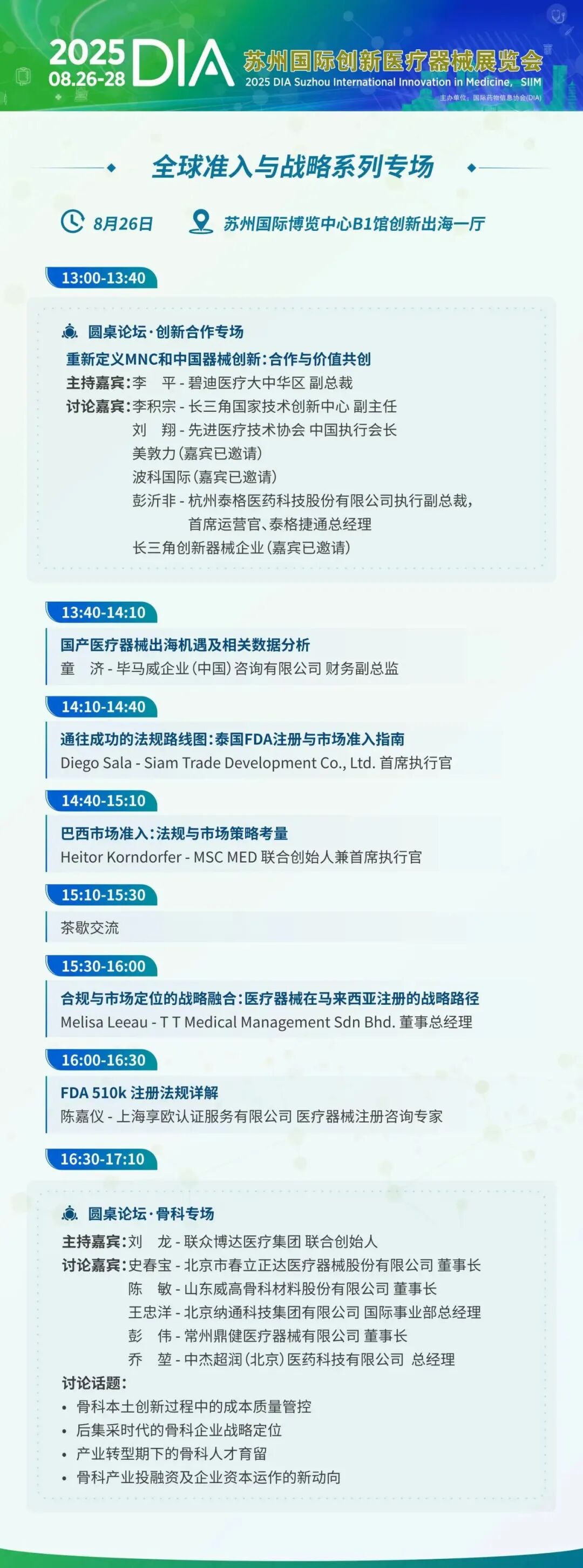 2025年8月26日至28日,2025 DIA蘇州國際創(chuàng)新醫(yī)療器械展覽會將與第十五屆中國醫(yī)療器械監(jiān)督管理國際會議在蘇州國際博覽中心同期舉辦。展覽會以“國產(chǎn)醫(yī)療器械全球準(zhǔn)入破局之道”為主題,展覽特設(shè):創(chuàng)新醫(yī)療器械、創(chuàng)新服務(wù)、臨床及轉(zhuǎn)化三大板塊。同期數(shù)十場學(xué)術(shù)研討會匯聚國際監(jiān)管機(jī)構(gòu)、全球頂尖醫(yī)療器械企業(yè)、臨床試驗機(jī)構(gòu)、法規(guī)專家及行業(yè)領(lǐng)袖,幫助企業(yè)解決發(fā)展瓶頸,助力搶占市場先機(jī)!
