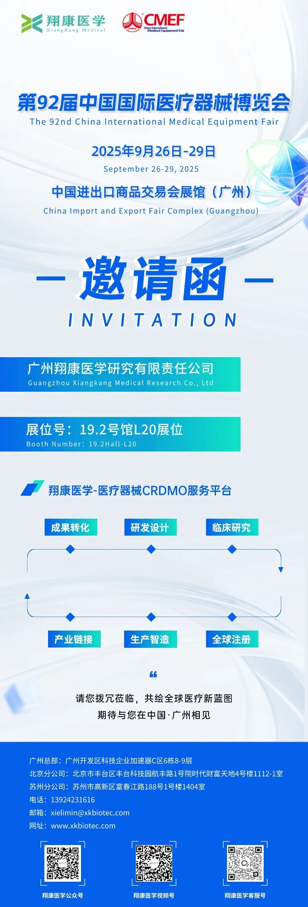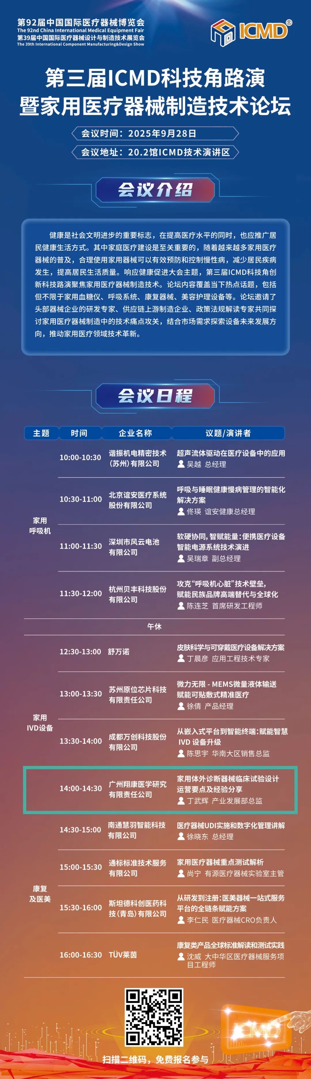 第92屆CMEF|翔康醫(yī)學(xué)與您相約廣州,共繪全球醫(yī)療新藍(lán)圖發(fā)表時(shí)間:2025-09-09 15:25 ![]() 屆時(shí),翔康醫(yī)學(xué)將攜“醫(yī)療器械CRDMO一站式解決方案”重磅亮相展會。我們期待與來自近4000家醫(yī)療器械企業(yè)、以及全球150多個(gè)國家和地區(qū)的與會嘉賓共同探討醫(yī)療器械高質(zhì)量發(fā)展新機(jī)遇。誠邀您蒞臨翔康醫(yī)學(xué)展臺(展位號:19.2L20)參觀交流、給予指導(dǎo)! 此外,翔康醫(yī)學(xué)產(chǎn)業(yè)發(fā)展部總監(jiān)丁武輝先生將于“第三屆ICMD科技角路演暨家用醫(yī)療器械制造技術(shù)論壇”發(fā)表專題演講,題目為《家用體外診斷器械臨床試驗(yàn)設(shè)計(jì)運(yùn)營要點(diǎn)及經(jīng)驗(yàn)分享》,期待您的關(guān)注。 ![]() ![]() ![]() 來翔康展位打卡拍照,獲“精美小禮物”!先到先得,送完即止,期待您的參與~ 合作及項(xiàng)目咨詢聯(lián)系人: 翔康醫(yī)學(xué)市場部陳先生 18520285131(同微信) 主題:家用體外診斷器械臨床試驗(yàn)設(shè)計(jì)運(yùn)營要點(diǎn)及經(jīng)驗(yàn)分享 時(shí)間:9月28日14:00-14:30 地點(diǎn):20.2館ICMD技術(shù)演講區(qū)“第三屆ICMD科技角路演暨家用醫(yī)療器械制造技術(shù)論壇” 講師: 廣州翔康醫(yī)學(xué)研究有限責(zé)任公司產(chǎn)業(yè)發(fā)展部總監(jiān)
